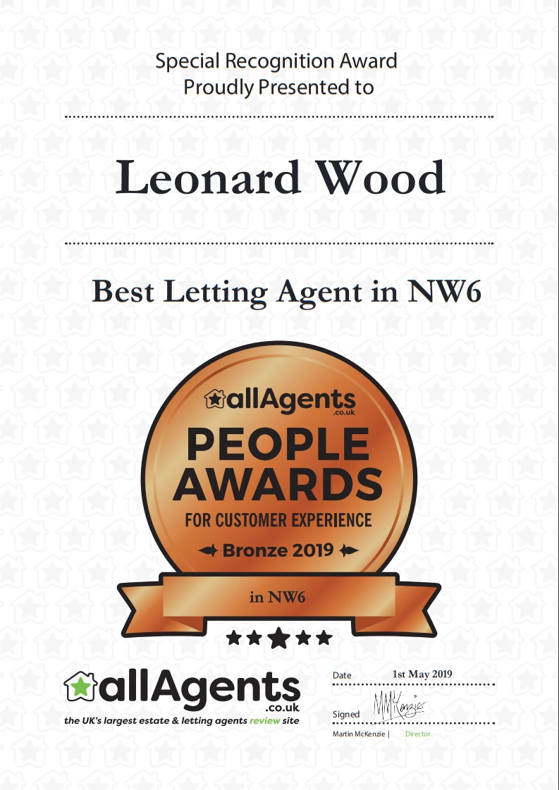 Congratulations to both Mark and Leonard on their awards of Silver and Bronze for the "Best Customer Experience" in NW6 for 2019. These awards are held annually and are given out on the number of positive reviews given to each staff member by either Landlord's or Tenant's. This year and similar to last year, ML Estates have received awards for the past few years on this basis and this means that we are keeping up the high standard of client attention and transparency.